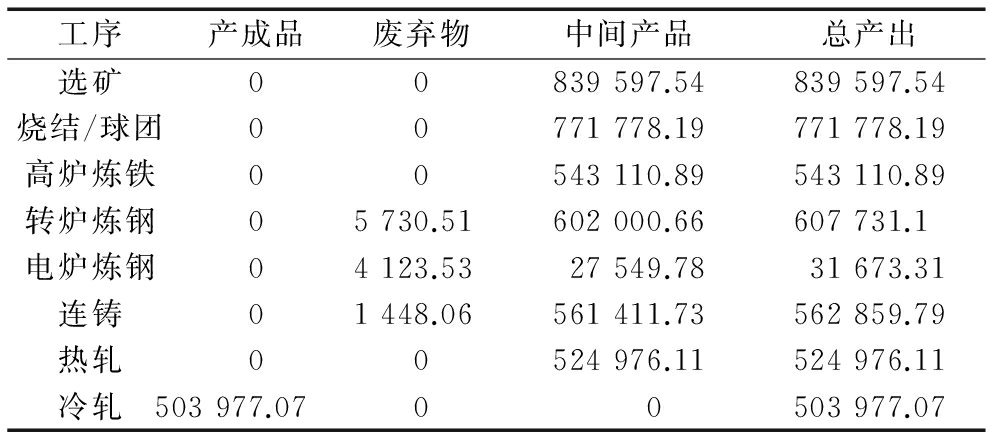 由钢铁生产系统的物质流图可以得到各工序的产成品、中间产品、废弃物和总产出数量,如表2所示。