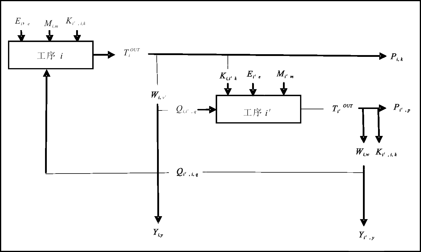 从而实现特定边界系统内废弃物排放的总隐性成本最低。在典型的生产过程中,包括在生产工序i投入所需能源e的数量(Ei,e),所需原材料m数量(Mi,m),从工序i′ 输出的中间材料k的数量(Ki′,i,k)以及从工序i′回收的废弃物q的数量(Qi′,i,q表示),从生产工序i阶段输出进入生产工序i′阶段的中间材料k的数量(Ki,i′,k),产成品p的数量(Pi,p)以及产生废弃物w的数量(Wi,w),如图4所示。