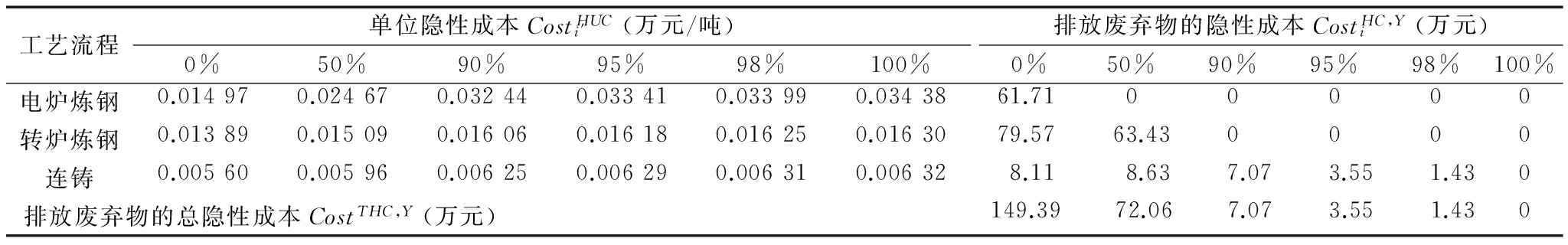 在表4、表5的基础上可以计算出各工序的单位隐性成本和废弃物排放的隐性成本。当回收率水平为50%时,电炉炼钢工序的单位隐性成本