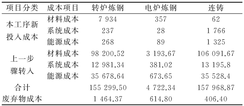 核算钢铁企业产生废弃物的3个工序所耗费的材料成本、系统成本、能源成本及汇总数,同时,依据废弃物占总产出的质量比核算废弃物成本:转炉炼钢工序产生的废弃物成本=155 299.5/(602 000.66+5 730.51) ×5 730.51=1 464.37万元,电炉炼钢工序产生的废弃物成本=4 722.34/(4 123.53+27 549.78)×4 123.53=614.80万元,连铸工序产生的废弃物成本=157 968.87/(561 411.73+1 448.06)×1 448.06=406.40万元,如表3所示。