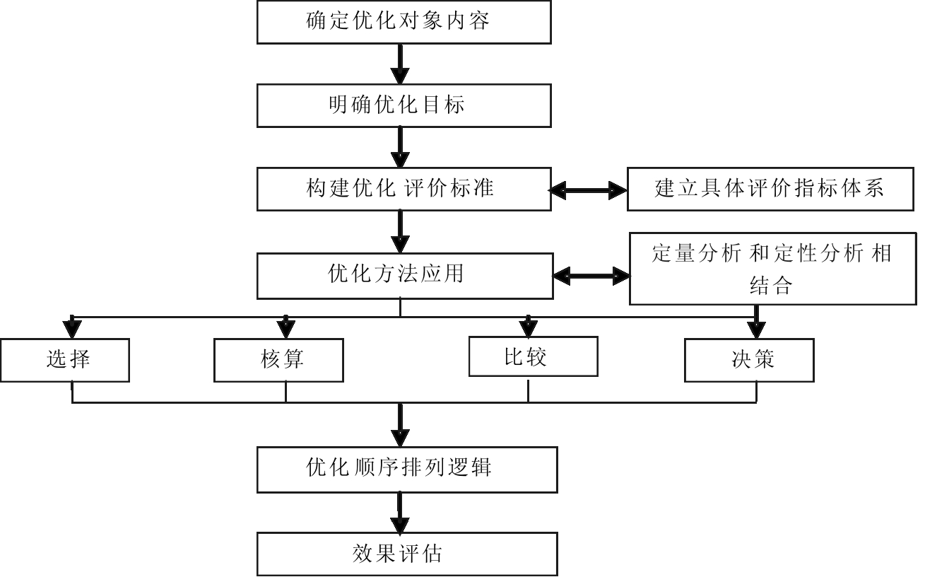 优化流程如图3所示。首先,要确定优化的对象内容,在了解企业资源限制条件后确定系统优化目标,在此基础上构建系统优化评价标准,选择合适的方法体系。评价标准和方法体系既要反映其内涵,又要综合考虑环境社会特性、企业工艺流程以及资源流转状态。在定量分析和定性分析相结合的基础上通过选择、核算、比较和决策等步骤进行评价分析,依据优化顺序的排列逻辑确定最佳次序,评估优化结果,实现流程优化。