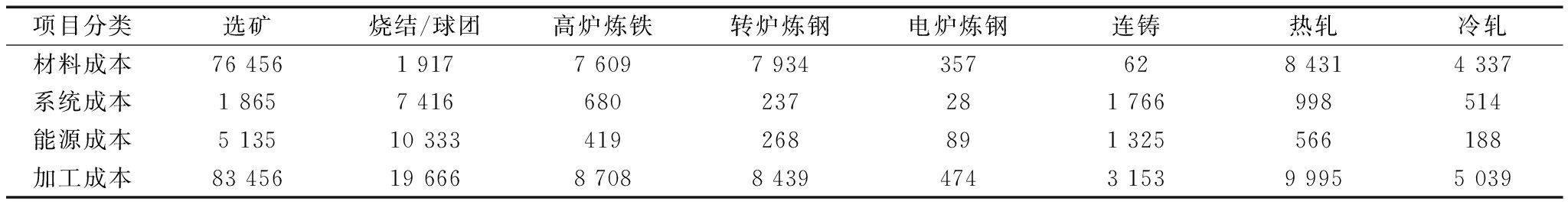 项目分类选矿烧结/球团高炉炼铁转炉炼钢电炉炼钢连铸热轧冷轧材料成本764561917760979343576284314337系统成本18657416680237281766998514能源成本513510333419268891325566188加工成本834561966687088439474315399955039