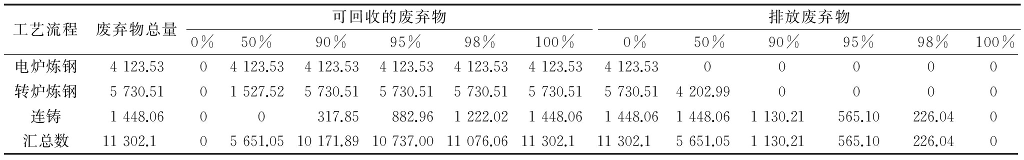 工艺流程废弃物总量可回收的废弃物0%50%90%95%98%100%排放废弃物0%50%90%95%98%100%电炉炼钢4123.5304123.534123.534123.534123.534123.534123.5300000转炉炼钢5730.5101527.525730.515730.515730.515730.515730.514202.990000连铸1448.0600317.85882.961222.021448.061448.061448.061130.21565.10226.040汇总数11302.105651.0510171.8910737.0011076.0611302.111302.15651.051130.21565.10226.040