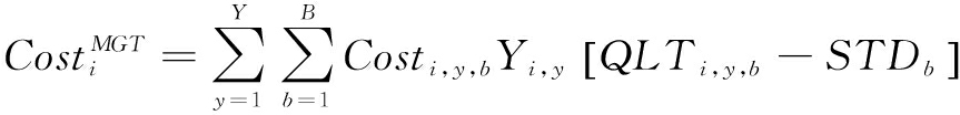其中,Costi,y,b代表排放的废弃物y和污染物b的单位排放成本,Yi,y代表工序i排放的废弃物y的数量,QLTi,y,b代表排放的废弃物y和污染物b的质量,STDb代表污染物b的标准排放限值。