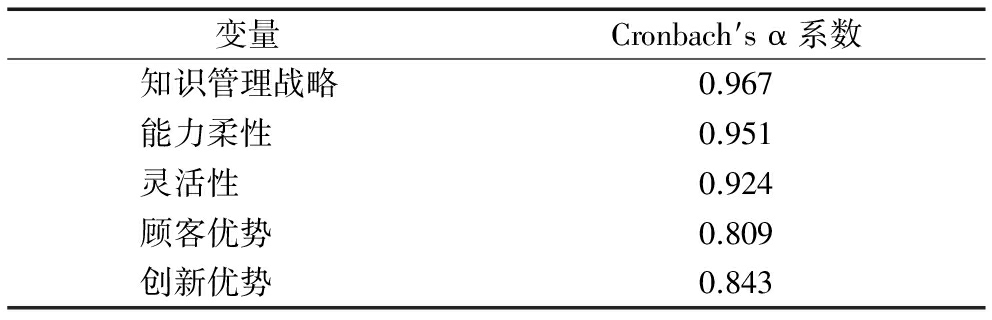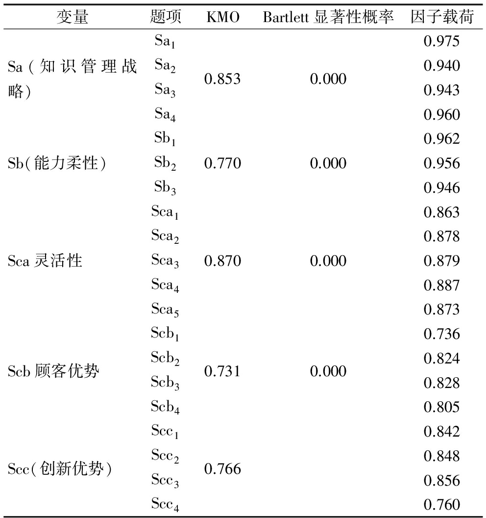 能力柔性测量借鉴Li等[25]的研究量表,以缩短开发时间的能力、未知领域经营能力和变化处理能力3个题项测量。知识管理战略借鉴Hansen等的研究量表,以知识交流密切程度、组织内部知识保护程度等4个题项测量。企业竞争优势测量借鉴Vogel[10]的量表,其中灵活性以及时采取竞争对手应对策略、短时间决策调整等5个题项测量。顾客优势以顾客忠诚度等4个题项测量。创新优势以新技术开发、工作方式创新等4个题项测量。竞争优势共3个维度13个题项,所有题项采用Likert五级量表。