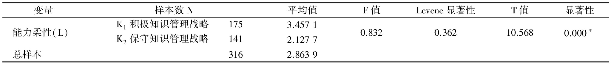 首先,对样本进行分类。利用SPSS软件对316个样本数据进行知识管理战略平均值聚类(K-),设定聚类数为2,结果显示两类样本量分别为175、141。将高于均值的样本命名为K1积极知识管理战略(175),低于均值的样本命名为K2保守知识管理战略(141)。其次,对能力柔性均值进行统计。利用SPSS软件对总样本进行描述性统计,以能力柔性为变量,结果如表4所示,能力柔性的平均值为2.863 9。最后,进行独立样本T检验。对K1积极知识管理战略和K2保守知识管理战略两组样本的能力柔性进行独立样本T检验。检验结果如表4显示,两组样本不存在方差不齐的情况(P=0.362>0.05),在能力柔性上具有显著差异(P=0<0.05)。其中K1样本的能力柔性平均值大于总样本平均值(3.457 1>2.863 9),K2样本的能力柔性平均值小于总样本平均值(2.127 7<2.863 9)。总体情况说明大多数企业实现了高能力柔性(L1)与积极知识管理战略(K1)匹配、低能力柔性(L2)与保守知识管理战略(K2)匹配。