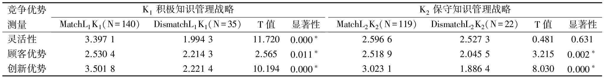 为验证能力柔性与知识管理战略匹配对企业竞争优势的影响假设,根据上述结果,统计出匹配(MatchL1K1、MatchL2K2)样本量分别为140、119,而不匹配(DismatchL1K1、DismatchL2K2)样本量分别为35、22。按知识管理战略类别对匹配组和不匹配组进行独立样本T检验。检验结果如表5所示,除了K2保守知识管理战略样本的灵活性在匹配组和不匹配组间的差异不显著以外,其它结果均具有显著性。表5显示K1积极知识管理战略匹配样本的灵活性、顾客优势、创新优势的平均值(3.86、3.94、4.31)均高于不匹配样本的平均值(1.62、2.42.2.44)。同理,K2保守知识管理战略匹配样本的顾客优势、创新优势的平均值(3.53、3.49)均高于不匹配样本的平均值(2.30、1.61)。因此,高能力柔性与积极知识管理战略匹配(MatchL1K1)对灵活性、顾客优势和创新优势具有积极影响;低能力柔性与保守知识管理战略匹配(MatchL2K2)对顾客优势和创新优势具有积极影响,但对灵活性的影响不显著。因此,H1、H3、H4、H5、H6得到验证,H2未得到验证。