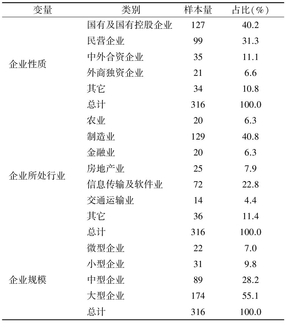 本研究样本数据来源于吉林、哈尔滨、辽宁、北京、广东、上海、浙江、福建、南京等省市知识管理战略实施企业。采用问卷调研法获取数据,共发放问卷600份,回收392份,有效问卷316份,样本回收率52.7%,如表1所示。
