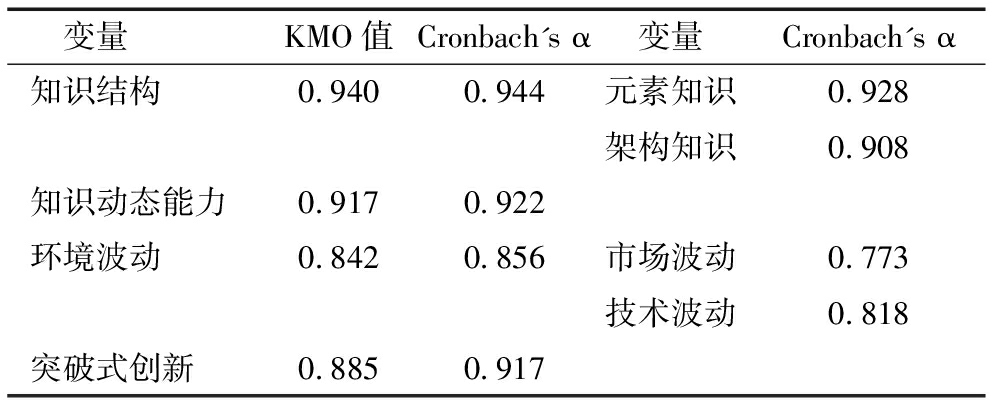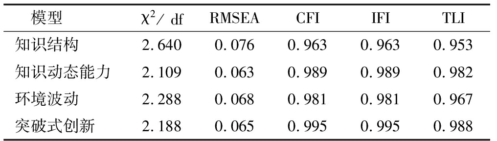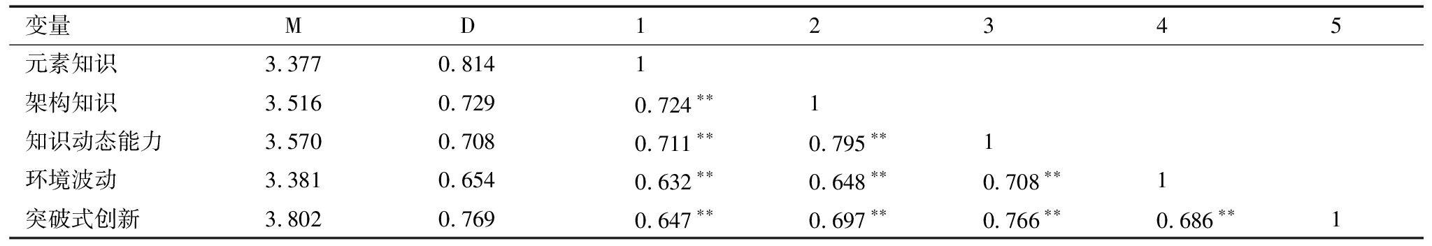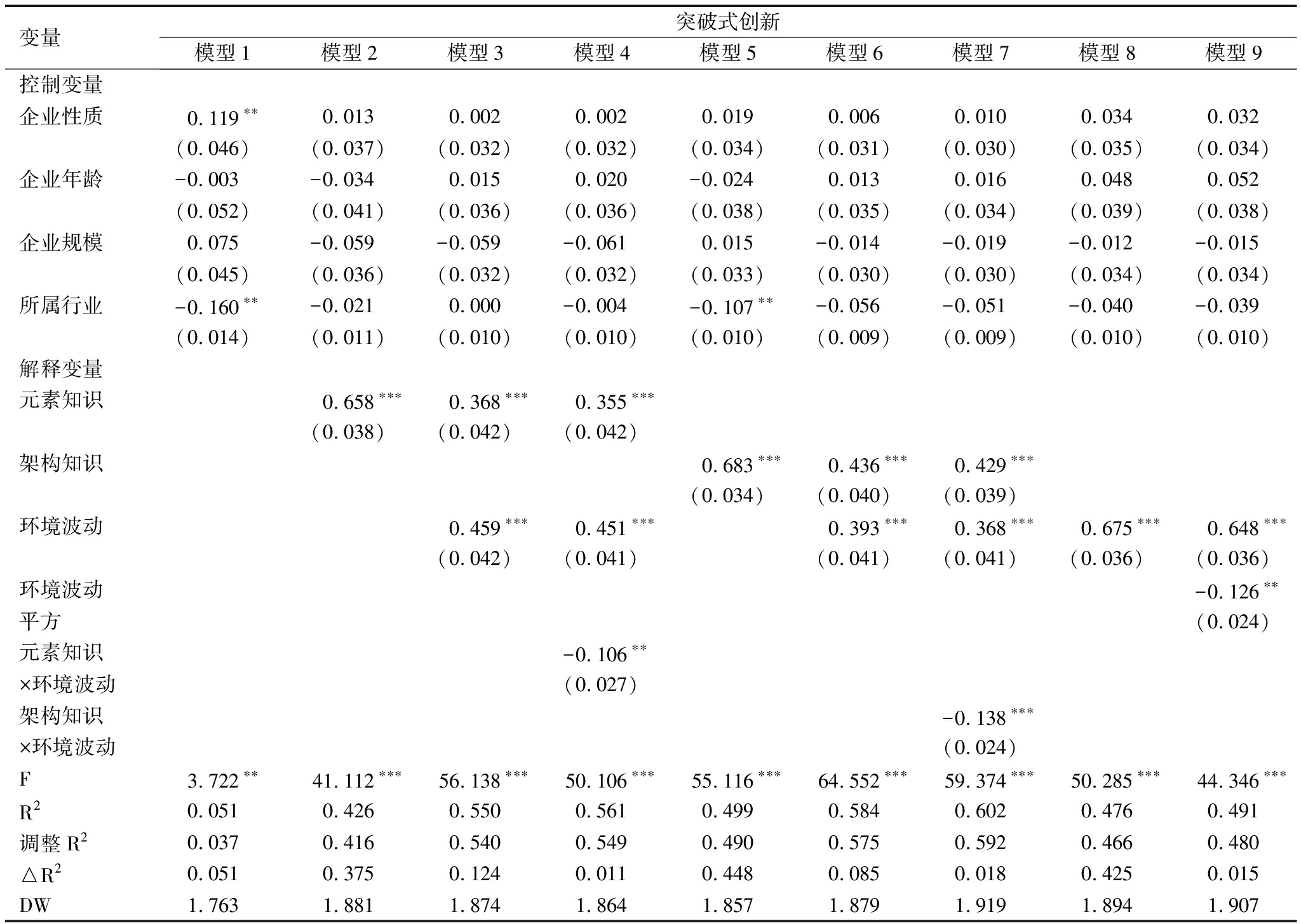 各变量均值、方差和相关系数如表3所示,自变量、因变量、中介变量及调节变量均显著相关(p<0.01)。其中,元素知识与突破式创新呈现显著正相关关系(p<0.01),元素知识与环境波动呈现显著正相关关系(p<0.01),元素知识与知识动态能力呈现显著正相关关系(p<0.01),架构知识与突破式创新呈现显著正相关关系(p<0.01),架构知识与环境波动呈现显著正相关关系(p<0.01),架构知识与知识动态能力呈现显著正相关关系(p<0.01),环境波动与突破式创新呈现显著正相关关系(p<0.01),知识动态能力与突破式创新呈现显著正相关关系(p<0.01)。上述结果为后续相关变量之间的关系分析、调节效应和中介效应检验提供了必要条件。