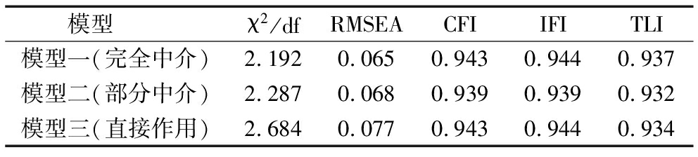 本研究使用AMOS18.0统计分析软件进行潜变量路径分析,拟合方程的相关参数如表5所示。3个模型的各拟合指标均达到适配标准,但模型一的各拟合指标更适配,为最佳匹配模型。其中χ2/df为2.192,RMSEA为0.065,CFI为0.943,IFI为0.944,TLI为0.937,拟合度最理想。