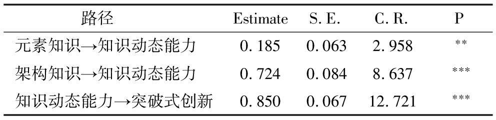 根据完全中介模型分析得到该模型路径系数结果(见表6),元素知识正向影响知识动态能力(β=0.185,p<0.01),架构知识正向影响知识动态能力(β=0.724,p<0.001),知识动态能力正向影响突破式创新(β=0.850,p<0.001)。因此,知识动态能力在知识结构与突破式创新关系中发挥完全中介作用,H4得到验证。架构知识与知识动态能力的回归系数明显大于元素知识,说明架构知识更容易通过知识动态能力推动突破式创新,H1c得到支持。