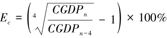式(3)中,Ec表示5年平均经济增长率动态值,用百分数表示。CGDP表示年城市生产总值,n表示当前年份(5年中的末年),n-4表示基期年份(5年中的首年)。