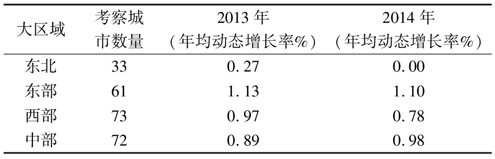 (1)总体情况。2013年239个被考察的地级以上城市年末总人口为31 269.1万人,其5年人口年均动态增长率均值为0.89%。其中,增长率为正的城市有188个,占78.7%;增长率为负的城市有51个,占21.3%。2014年,239个城市的5年人口年均动态增长率均值为0.81%。其中,正增长率的城市有183个,占76.6%;零增长的1个;负增长率的城市有55个,占23.0%。
