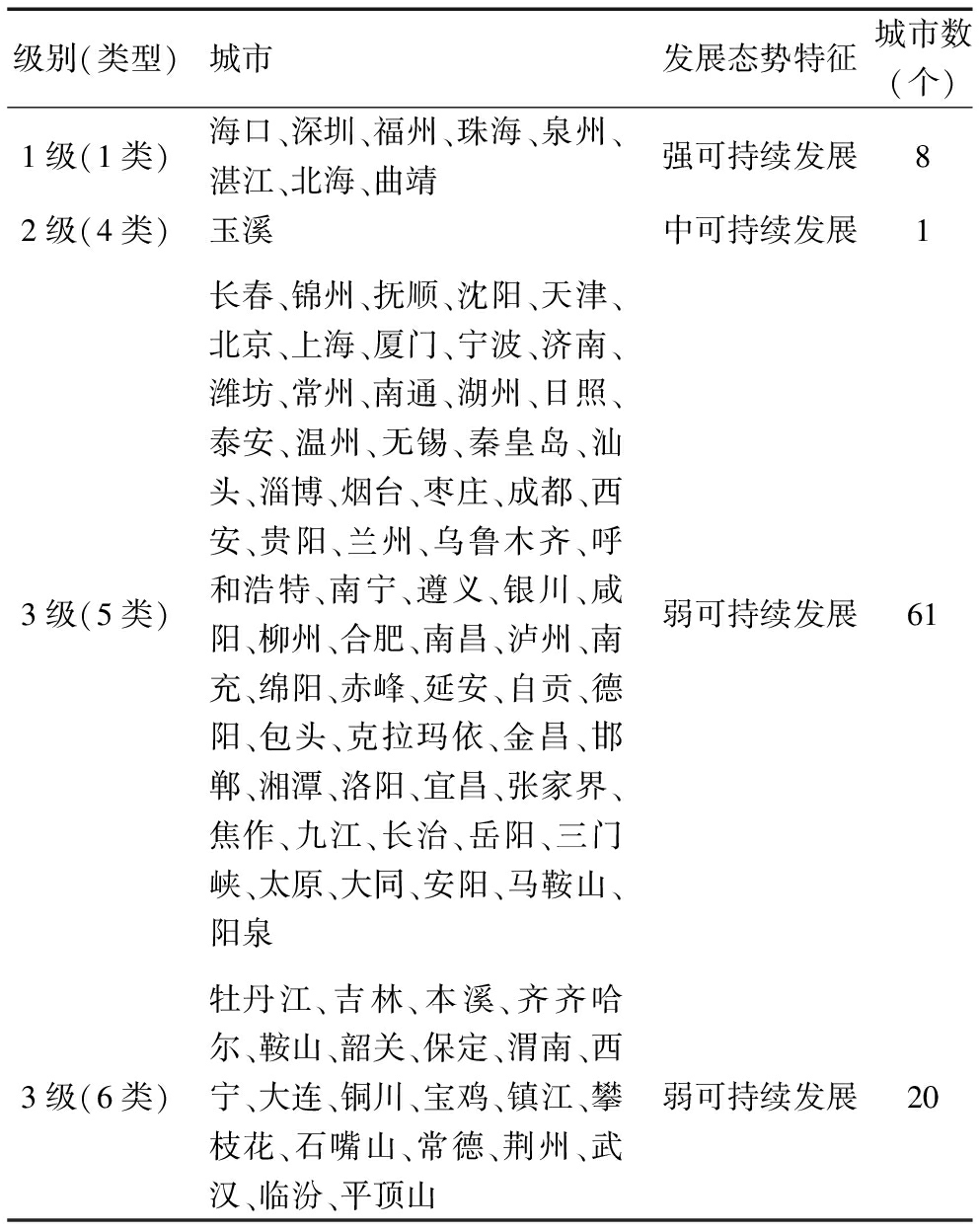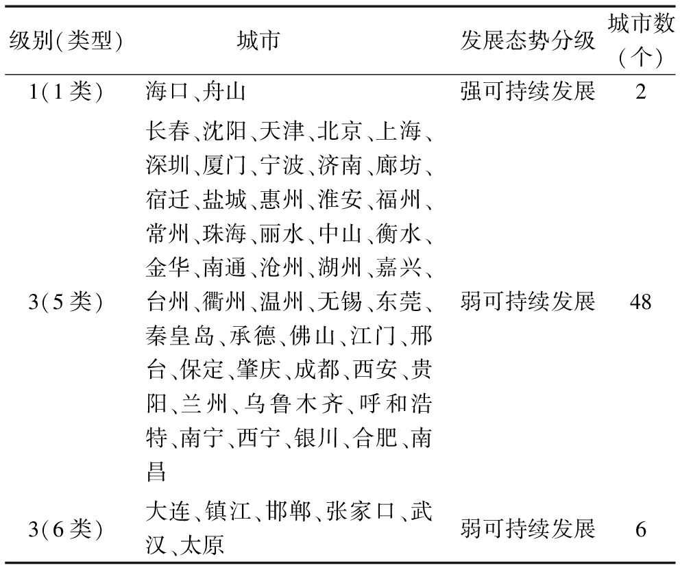 (3)第3级弱可持续发展:人口增加(或减少),环境约束超出,经济上行。该类城市属弱可持续性水平。该级城市在中国占绝大多数,表现为经济增速较快,城市集聚效应得以发挥。在经济高速增长的带动下,劳动效率提升,就业机会增多,城市公共基础设施条件不断完善,城市人口增长。但是,其经济增长类型仍是粗放型,尤其生态环境污染较为严重,城市发展对自然生态系统的压力超出了适度范围。该类型城市经济发展以生态环境损害为代价,其发展潜力堪忧,应该引起高度警惕。
