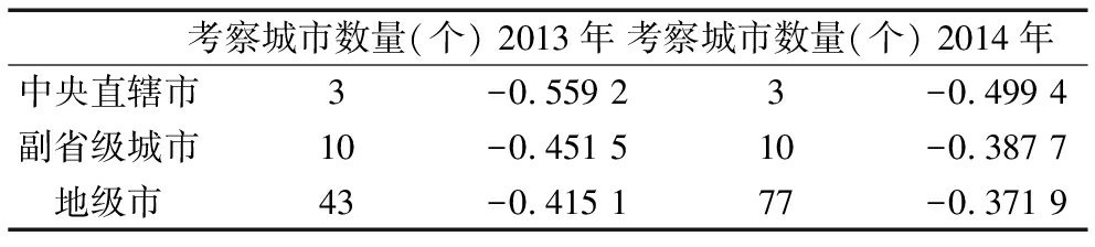 (2)基于省际、行政级、大区域划分的城市分组分析。按照省际划分,可得到29个省级区域的城市空气指标达标分布数值。2013年,除数据不可得的重庆、西藏、黑龙江、河南、湖南、云南6个省(市)外,其余25个省区的城市空气PM2.5浓度指标达标水平的算术平均值为-0.453 4。空气PM2.5污染达标水平最高为0.296 3(海南),最低-0.681 8(山东)。全国仅海南省空气达标,占所有省区的4%,其余24个省区城市平均达标水平均值小于0。2014年,全国内地29个省区城市空气PM2.5浓度指标达标水平的算术平均值为-0.344,表现最好的是0.521 7(海南),最不理想的是-0.616 9(河北)。全国仅3个省区的城市平均空气指标达标水平大于0,占10.3%,分别为海南、福建、云南,较2013年情况稍有好转,其余26省区的城市指标值均小于0。