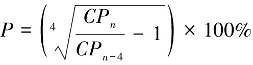 式(1)中,P表示5年人口年均增长率动态值,CP表示年城市生产总值,n表示当前年份(5年中的末年),n-4表示基期年份(5年中的首年)。