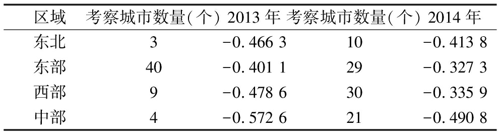 考察“四大板块”城市空气PM2.5浓度达标水平。2013年、2014年,所有区域指标均值全部小于0,即全部超过二级标准限值(见表5),显示出空气污染程度过重的普遍趋势。相较而言,东部最好,西部和东北次之,中部情况最差。这与我国经济发展产业区域分工一致,也与大气环流条件有一定关系。东部地区经济发展水平最高,服务业、信息产业等高产值、低污染的产业产值占地区生产总值的比重较大,这得益于近年来地方政府力主将传统污染源企业搬迁等因素推动,再加上陆海型空气对流条件的助力。北京市空气污染水平常受到天气状况主导,是一个典型例证。西部和东北城市则受限于较低的人口密度和较小的经济规模,在能源使用水平和污染排放总量上相对较低。中部地区则汇集了我国当前主要产煤和工业城市,严重依赖重化工制造业的生产格局,由于尚不完善的环境管理体制,加上大陆大气环流相对封闭,导致其空气PM2.5浓度污染程度最为严重。此外,2014年空气污染程度较2013年有明显缓和,显示出改善趋势。