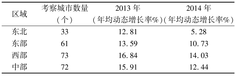(2)基于省区、行政级、大区域划分的城市分组分析。2013年 29个省区的城市GDP年均动态增长率均值为15.33%,指标值最高为18.78%(贵州),最低为9.44%(上海)。29个省区的城市年均动态增长率均明显大于2.5%。2014年,29个省区城市分组生产总值年均动态增长率的算术平均值为12.06%,指标值最高为18.89%(贵州),最低为2.54%(黑龙江)。由此可见,中国城市经济呈高速增长态势,但2014年较2013年增速有所下降。
