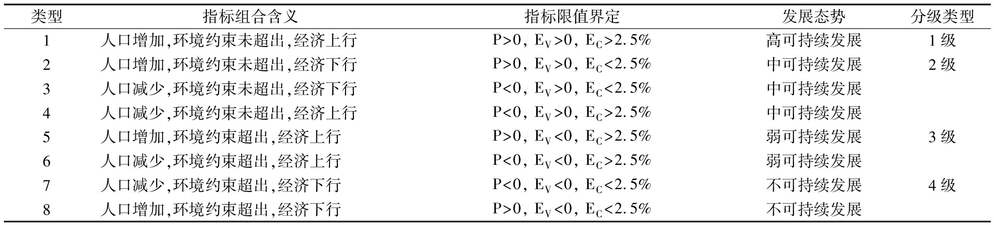 城市可持续发展是社会进步、环境保护、经济增长三大支柱的协调发展问题。社会人口变化状况是城市发展状态的综合体现,经济增长是城市可持续发展必要的物质基础,环境保护是城市可持续发展的制约条件。城市发展态势的3个维度,分别采用5年人口年均增长率动态值(P)、空气PM2.5浓度污染水平达标率(EV)、5年经济GDP年均增长率动态值(EC)进行表征并作为评价指标,通过不同的三维指标组合,评判城市可持续发展态势。三三组合共划分8种类发展态势,进一步对发展态势水平进行分级,分为4个级别:强、中、弱、欠可持续性。该分类方法可概括为“8类4级” 分类方案。如表1所示,第1级仅包括1种;第2级包括2、3、4种;第3级包括5、6种;第4级包括7、8种,其中第8种客观不会存在,除非受人为干涉等异常原因影响。