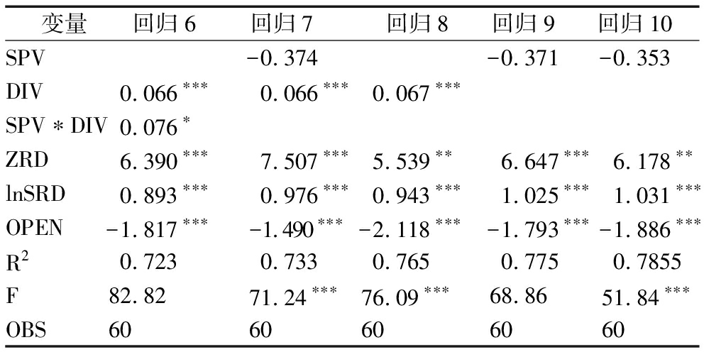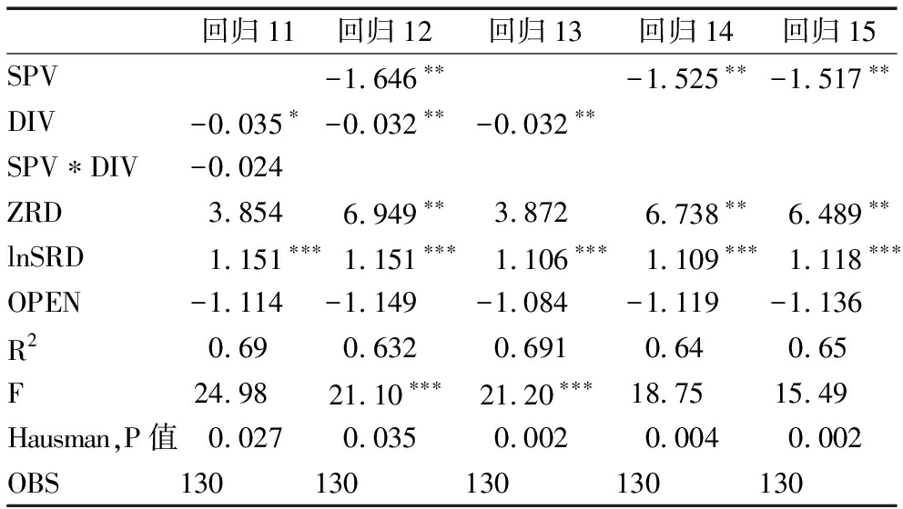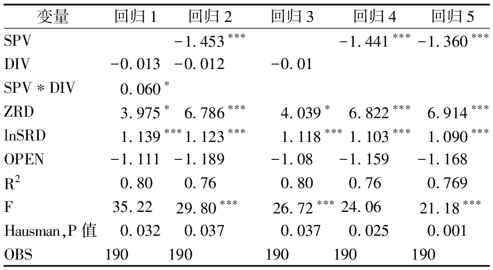 为探究专业化与多样化集聚的交互作用对产业创新活力的影响,加入SPEit*DIVit的交互项,形成模型(2):