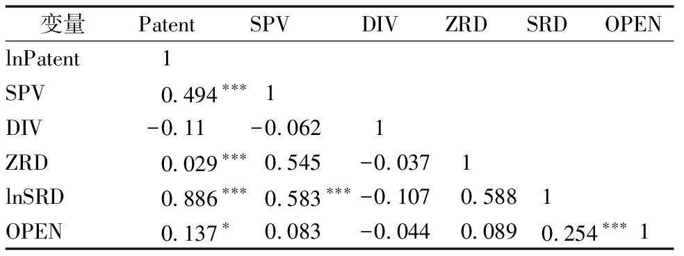 其中,lnPatent为被解释变量,表示产业创新活力;SPE、DIV为解释变量, 分别表示专业化产业集聚与多样化产业集聚水平;ZRD、SRD、OPEN为控制变量,分别表示产业科研人员投入水平、科研经费投入水平及外商投资水平;下标i和t分别表示行业和年份; 其它字母分别表示模型常数项、变量系数及模型残差。