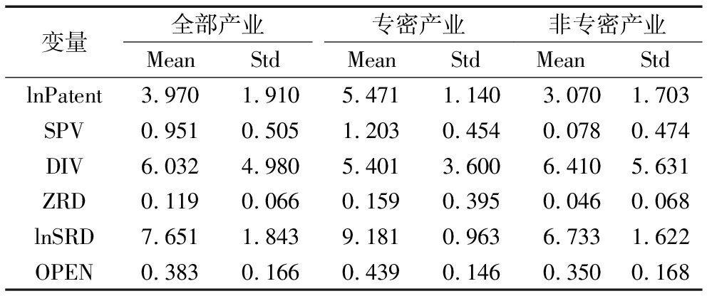 本文数据从2012-2016年《江苏省统计年鉴》、《江苏省科技统计年鉴》中摘录,剔除个别缺失数据,选取38个工业产业共190个有效样本数据。依据《江苏省知识产权密集型产业统计报告》公布的江苏省专利密集型产业目录,将医药制造业、化学原料及化学制品制造业等12个行业列为专利密集型产业,共60个有效样本。其余26个行业共130个样本作为非专利密集型产业。