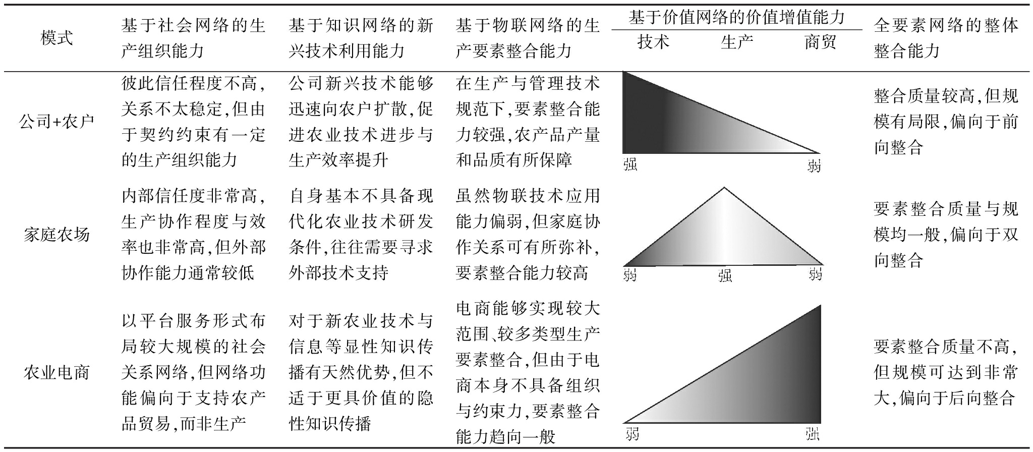 虽然技农贸一体化无论是在学术界还是在实业界,都只是一个昙花一现的概念,但是事实上后续很多思潮都具有技农贸一体化思想。例如:精准农业是基于农业信息技术与农业生产相结合的发展理念[8],现代农业概念与之相似,但内涵更加泛化和丰富[9];农业电商是农产品生产与贸易相对接的发展模式[10];农业产业化是一个将农业技术、生产与贸易融为一体的概念[11]。如果将上述不同的农业发展理念归纳到技农贸一体化研究框架下,那么技农贸一体化发展模式可总结为3种类型:以农业技术公司、农业龙头企业为主体,向农业生产和农产品贸易延伸的“公司+农户”模式;以农户、农业生产合作社为主体,后向引入新兴技术、前向寻求商品化渠道的“家庭农场”模式;以农产品经销商、电商为主体,将农业新技术培训与推广、组织农业规模化生产、农产品贸易整合为一体化产业链,打造农村与城市对接、闭环物流与供应链的“农业电商”模式。这3种模式由于驱动主体、产业链路径、运营模式不同,最终在全要素网络格局和增值模式上差异较大。