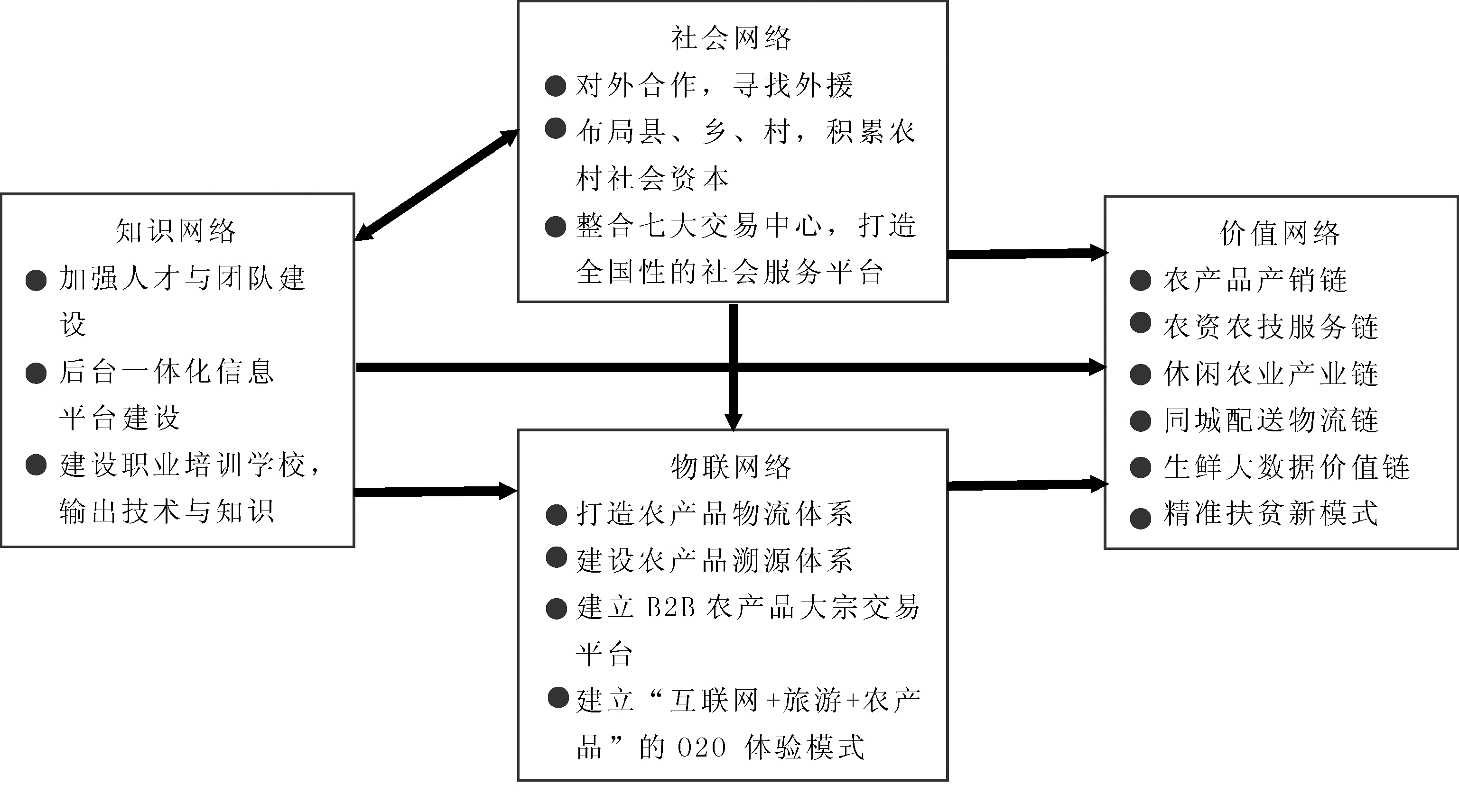 “供销e家”的业务架构充分体现了全要素网络的思想。第一,“供销e家”在全国有7个大型交易中心,在网络运营层面,始终坚持“前端多样化、后台一体化”的建设原则,保持全国客户与产品信息的互联互通;第二,“供销e家”依靠后台提供的数据交换、智能配送、信息发布等功能,打造县、乡、村三级信息处理和物流管理体系,有效实现了信息流与物资流融合与同步;第三,“供销e家”非常重视对外合作(目前达成战略合作协议的有顺丰、新华社、中国移动、中国银行等),以此完善其社会网络。而且,“供销e家”致力于深入县、乡、村布局农产品供销网络,坚持为具有地方特色的名优农产品提供产供销服务,积累了丰厚的农村社会资本;第四,“供销e家”充分发挥物联网技术优势,将物联网技术广泛应用于农产品物流体系、农产品溯源体系建设;第五,“供销e家”有效整合知识网、社会网、物联网等技术与资源,优化业务布局并强调价值增值,促进价值网络建设与健全。目前,“供销e家”已形成农产品销售、农资农技服务、休闲农业产业园建设、生鲜农产品同城配送、精准扶贫等多业务链并进的价值网络格局,“供销e家”全要素网络架构如图2所示。但是,“供销e家”成立时间尚短,在4种网络融合方面有待提升,目前只是四网融合雏形,离完善、健全的全要素网络还有较大差距。