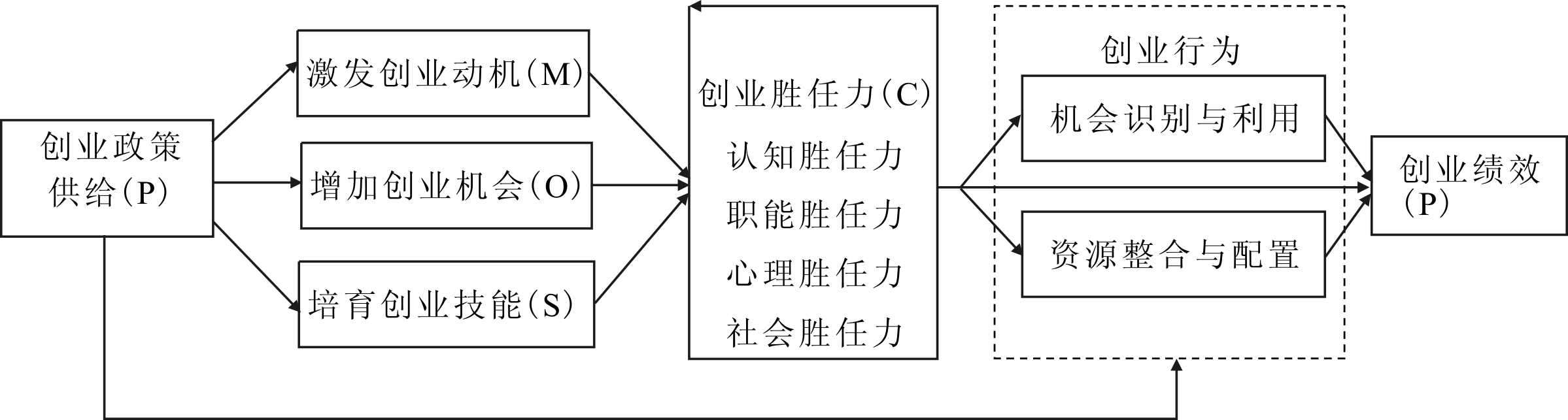 由创业MOS模型可知,政府通过动机激发(M)、机会增加(O)和技能培育(S)三维度政策工具,既能激发创业者创业热情和创业意愿,又能提供更多创业机会,还可提升创业者创业能力,故而能促进新创企业成长。基于此,本文以“创业政策供给—创业胜任力—创业行为—创业绩效”为研究脉络,解析创业政策供给对创业者创业胜任力的影响机制,即政府通过动机激发、机会增加、技能培育等政策措施,能提升创业者认知胜任力、职能胜任力等创业胜任力,进而有助于创业者创业机会识别和创业资源整合,从而能够有效提升创业者创业绩效,如图1所示。