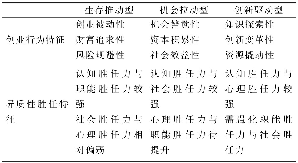 创业者(Entrepreneur)是创业活动的核心主体,其通过创业机会识别、评价和开发,实现生产要素新组合[3]。当前,国外有关创业者胜任特征的研究主要聚焦在创业胜任力和创业模式等方面。例如,有学者从特质和技能视角出发,指出创业胜任力是指创业者识别、利用机会的能力,其包含个人特质、知识技能、心智属性等维度[4];也有学者基于环境和过程视角,认为创业胜任力是指创业者与复杂创业环境和创业过程良好匹配的适应能力,并提出社交关系能力、资源筹集能力等创业胜任力维度[5]。鉴于创业者素质和能力影响创业模式选择[6],国外学者对创业模式进行了探讨。例如,GEM(2015)结合创业者创业意愿、失败恐惧感等个人特质差异,探究了创业者择业动机,提出生存型(Necessity-Driven)、机会型(Opportunity-Driven)和改善型(Improvement-Driven)3种创业模式。再如,有学者指出不同创业者通过创业资源拓展整合,能实现新创企业独有的生产经营活动,并将创业模式划分为机会获取型、创新驱动型等类型[7]。基于国外研究,当前国内有关创业者胜任特征的研究主要聚焦在胜任力结构[8]、创业模式[9]和创业过程等方面。鉴于创业模式选择和创业过程实施依赖于创业者创业胜任力[10],因此国内研究日益关注创业胜任力内涵与结构维度。例如,陈建安[11]基于国外研究,从能力胜任力、社会胜任力和心理胜任力3个方面剖析了创业胜任力结构维度,并提出培育和开发胜任力的具体措施。鉴于“能力胜任力”涵盖知识、技能、认知、经验等多方面,因此黄永春等[12]基于胜任力理论,构建了新兴产业企业家创业胜任力金字塔层级概念模型,其包括社会胜任力、职能胜任力、认知胜任力和心理胜任力等结构维度。由上述分析可知,目前国内外有关创业者胜任特征的研究主要集中在创业胜任力内涵和结构维度等方面,结合创业者类型深入探讨其异质性胜任特征的研究较少。