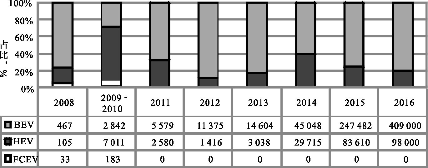 图3 2008-2016年中国3种类别电动汽车销量统计(单位:辆)