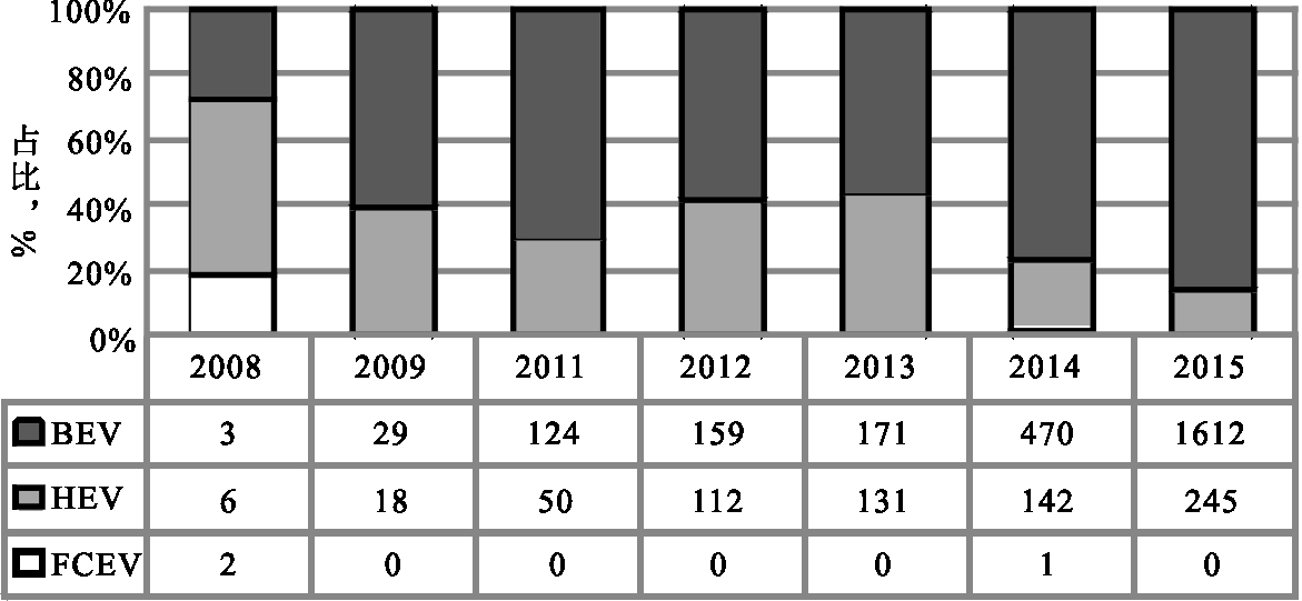 中国电动汽车车型发展历程反映出产品创新轨迹。图2给出了2008北京奥运会使用的三类电动汽车车型及2009-2015年中国工信部发布的三类电动汽车车型数量统计。