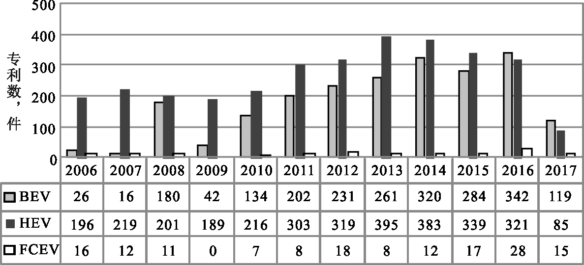 图1 2006-2017年中国3种类别电动汽车专利统计(单位:件)