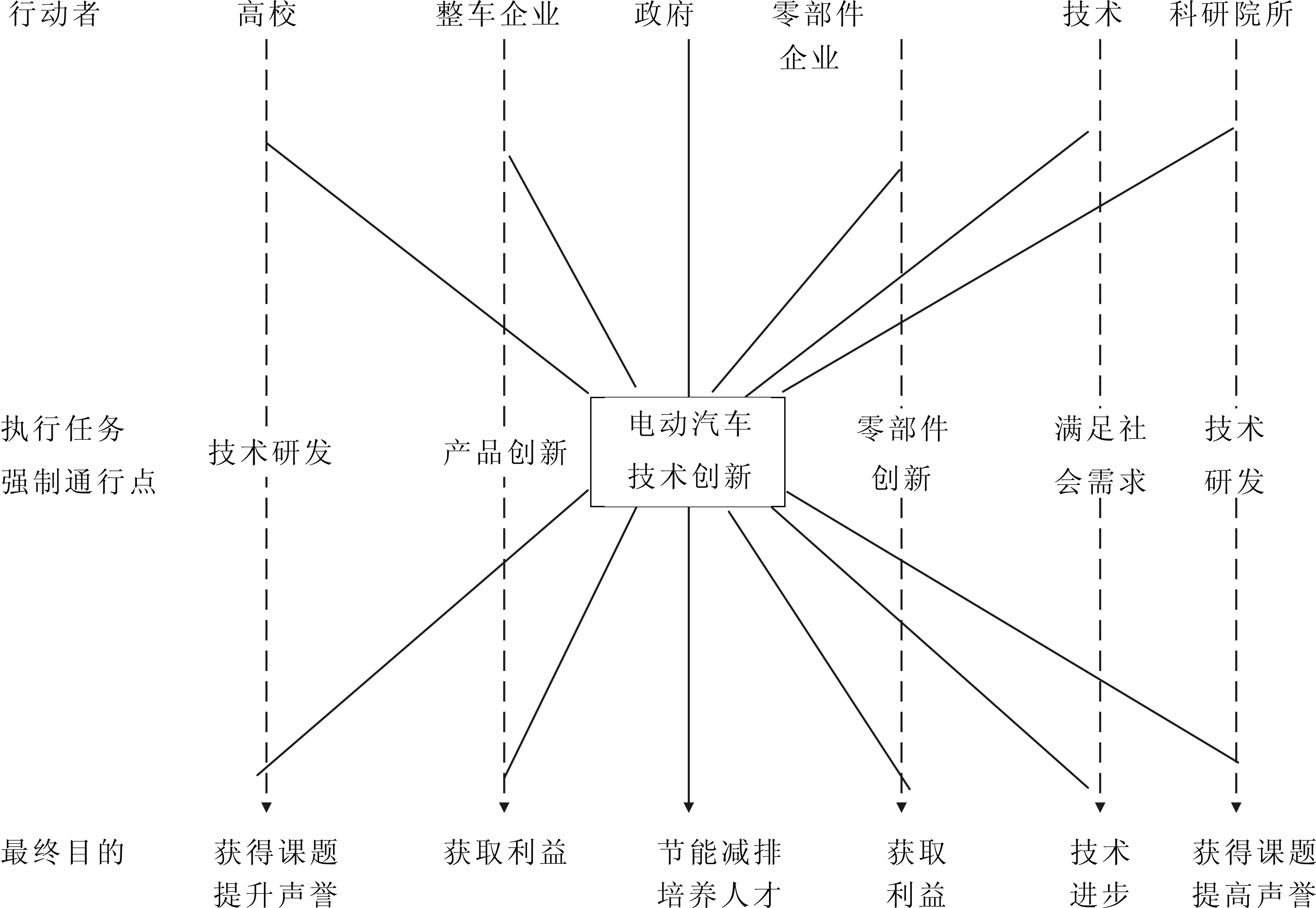 这一时期参与技术创新的行动者包括政府、高校、科研院所、整车和零部件制造企业,以及其它非人类行动者,其中政府是关键行动者。