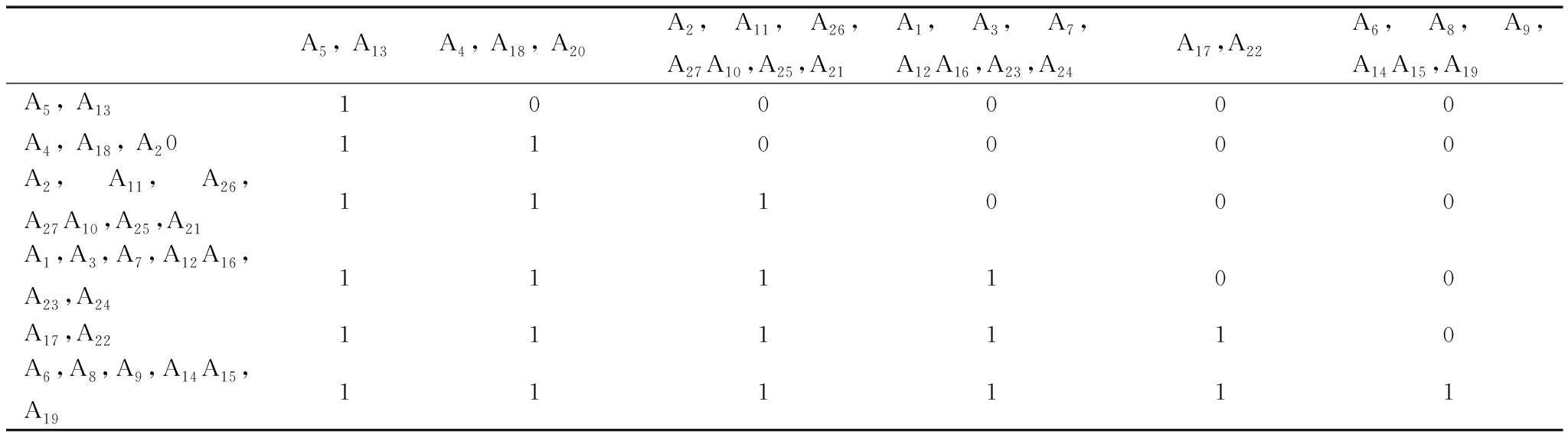 表1对应3个集合关系,分别是R(Ai)={Aj∈A|rij=1};A(Ai)={Aj∈A|rij=1}