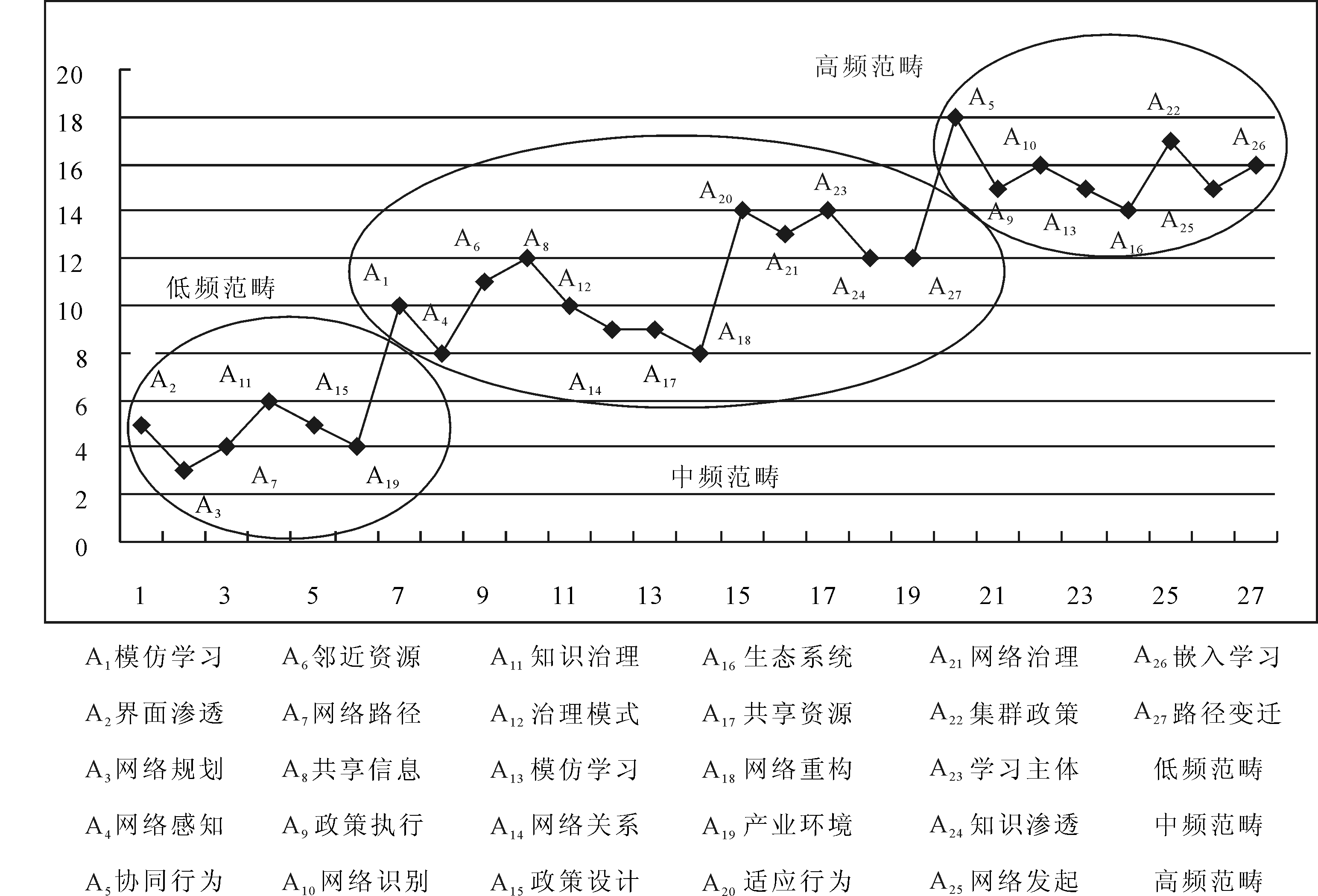 扎根编码小组根据27个典型范畴在312条语句中出现的频率,将其分为3类:低频范畴、中频范畴和高频范畴,具体划分标准为:低频范畴≤7次、8次≤中频范畴≤15次,以及高频范畴≥16次。图1中,上半部分表示范畴出现频率,其中,低频范畴共有6个,界面渗透5次,网络规划3次,网络路径4次等;中频范畴共有13个,模仿学习10次,网络感知8次,邻近资源11次等;高频范畴共有8个,协同行为18次,政策执行15次,网络识别16次等。