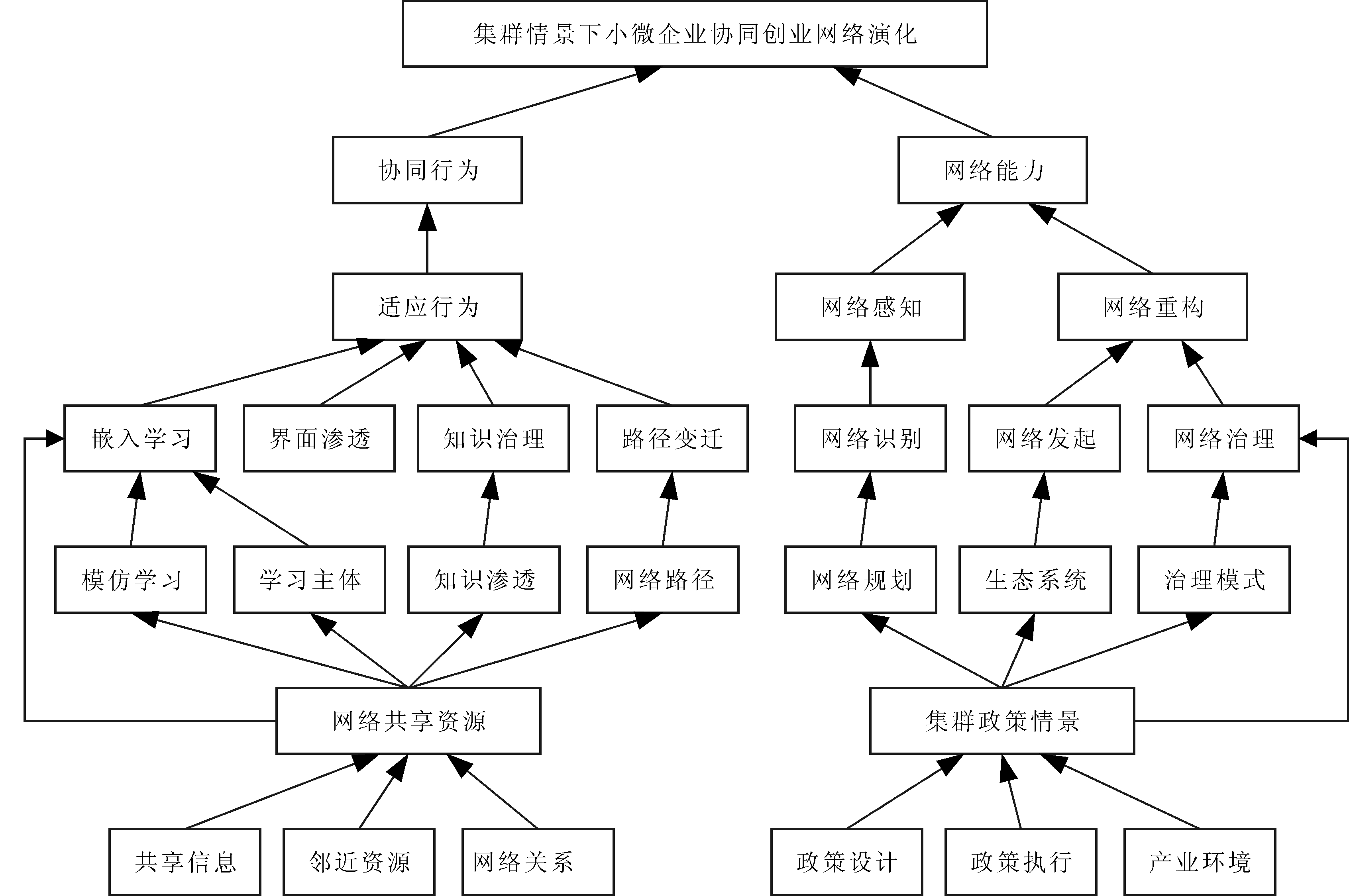 鉴于以上不足,本研究贡献如下:针对小微企业协同创业网络演化这一关键问题,将影响因素系统化为“网络共享资源→适应行为→协同行为”和“集群政策情景→网络感知/网络重构→网络能力”两条故事线,并贡献若干新颖见解,比如嵌入学习、界面渗透、知识治理和路径变迁是4类典型的小微企业适应性行为。