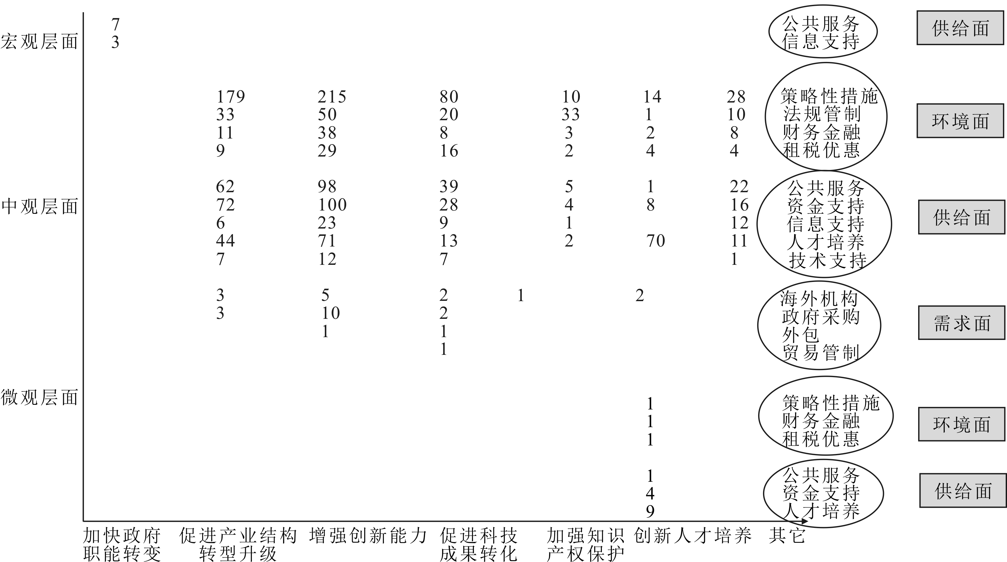 多维度分析主要是Z—X维度、Z—Y维度、X—Y维度及Z—X—Y维度等分析,具体分布见图7。从中发现,宏观层面主要是通过供给面政策工具(含公共服务和信息支持)加快政府职能转变。中观层面则通过三大类政策工具(含13种政策工具)增强创新能力,使用最多的是环境面政策工具(807次),其次是供给面政策工具(744次),最后是需求面政策工具(仅31次),而在13种政策工具中,使用最多的是策略性措施(526次),其次是资金支持(228次)。微观层面主要是通过供给面和环境面政策工具组合培养创新人才。