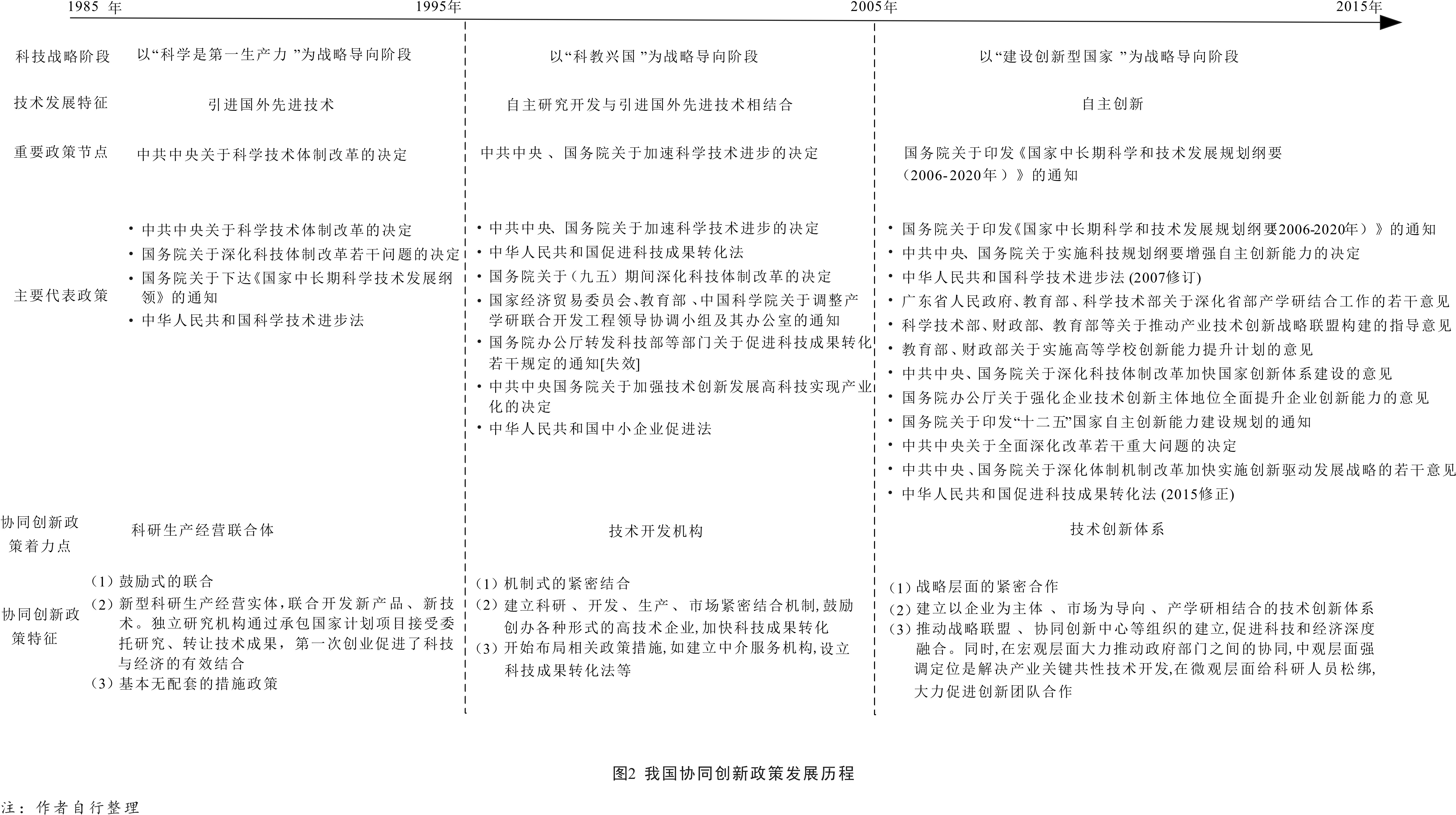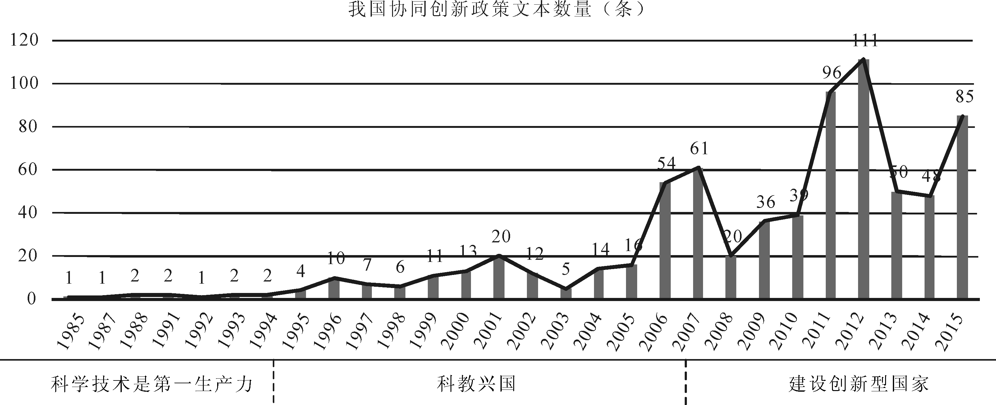 (1)科技战略阶段一:科学技术是第一生产力(1985-1995年)。这一阶段共发文15条,我国促进科技成果产出和转化方式呈现出从以科技规划为中心向国家科技计划转变。在此阶段,协同创新概念的雏形——科研生产联合体概念应运而生,其最初目的在于解决科研与生产相互脱节问题。随着1992年“产学研联合开发工程”的推进,协同创新概念进一步发展到产学研合作概念;1993年,《中华人民共和国科学技术进步法》进一步将各创新主体开展联合和协作以法律形式予以确认[38];1994年,《国家教委、国家科委、国家体改委关于高等学校发展科技产业的若干意见》鼓励高等学校结合自身优势特征建立科技企业,大力推进产学研合作联办科技企业;1995年,《中共中央、国务院关于加速科学技术进步的决定》提出要推动科研院所、高等学校和企业合作开发先进技术。然而,这一阶段出台的相关政策却并未清晰界定产学研合作主体,更多只是鼓励高校、科研院所产出和转化技术成果(李世超等,2011)。