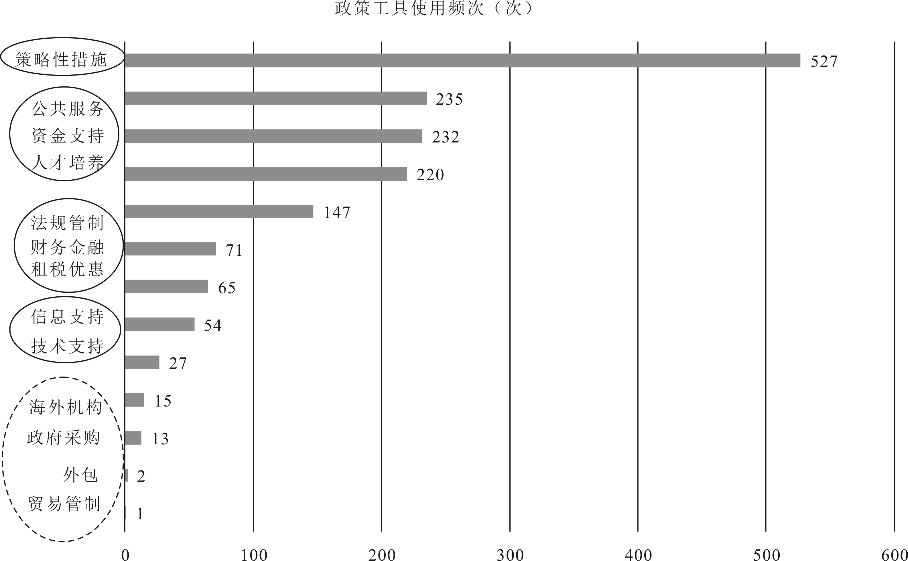 (3)Y维度:本文通过对协同创新政策3类政策工具进行统计发现(见图6),环境面政策工具使用频次最高(810次),其次是供给面政策工具(768次),最后是需求面政策工具(31次)。进一步对3类具体使用的政策工具进行统计,使用频次分布见图6。从中发现,环境面政策工具中使用频次居前3位的分别是策略性措施(527次)、法规管制(147次)和财务金融(71次);供给面政策工具中使用频次居前3位的分别是公共服务(235次)、资金支持(232次)和人才培养(220次);需求面政策工具整体使用频次偏低,使用相对较多的是海外机构(15次)和政府采购(13次),贸易管制和外包使用频次较少。