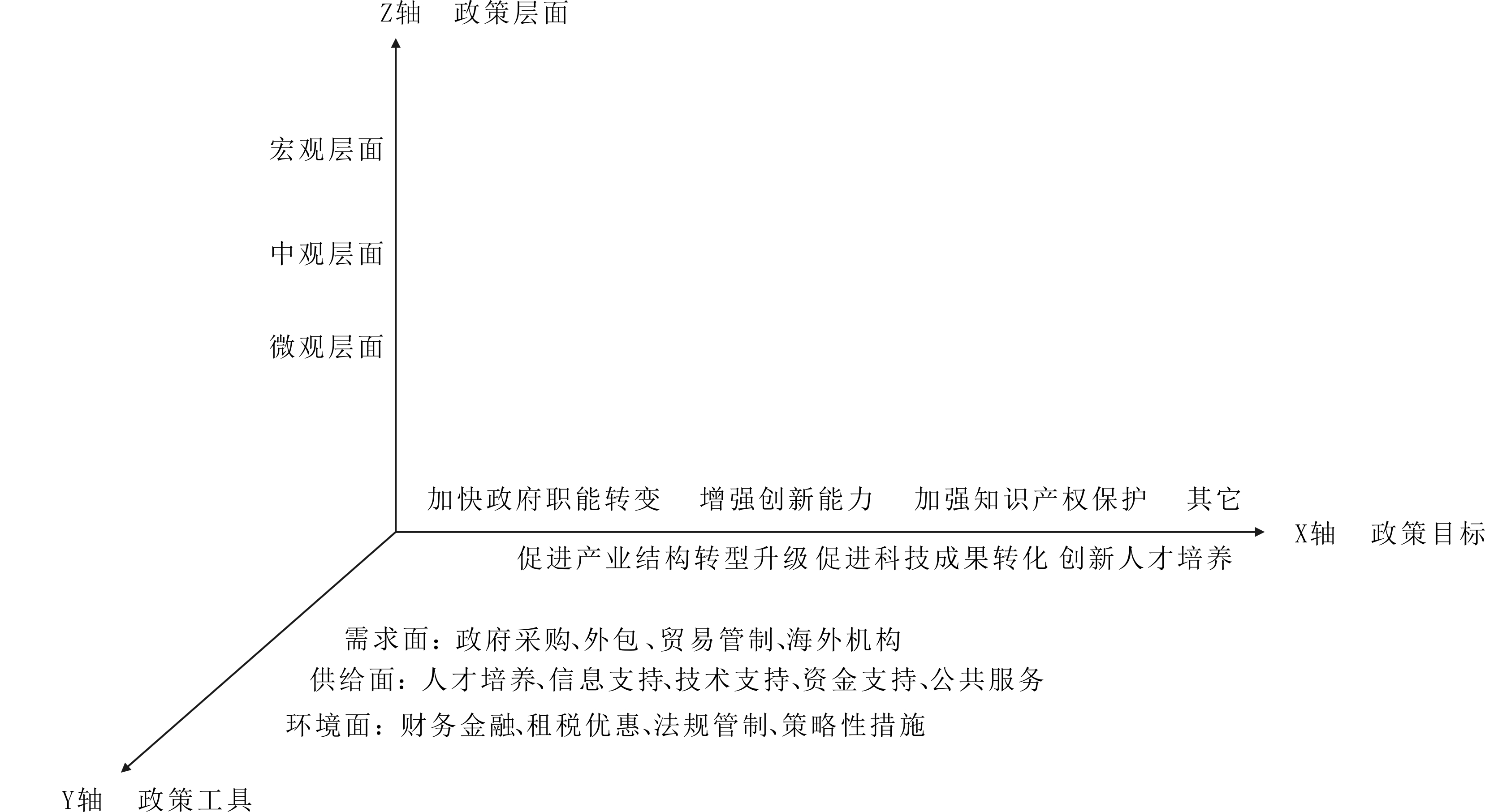 (2)Y维度:政策工具维度。基于Rothwell和Zegveld[19]提出的经典创新政策工具分类思想,本文构建协同创新政策分析基本政策工具维度,将协同创新政策涉及的政策工具分为供给面、需求面和环境面3种(赵筱媛等,2007)。其中,供给面政策工具包含人才培养、资金支持、公共服务、技术支持和信息支持;需求面政策工具包含贸易管制、外包、政府采购和海外机构;环境面政策工具包含策略性措施、租税优惠、财务金融和法规管制等。
