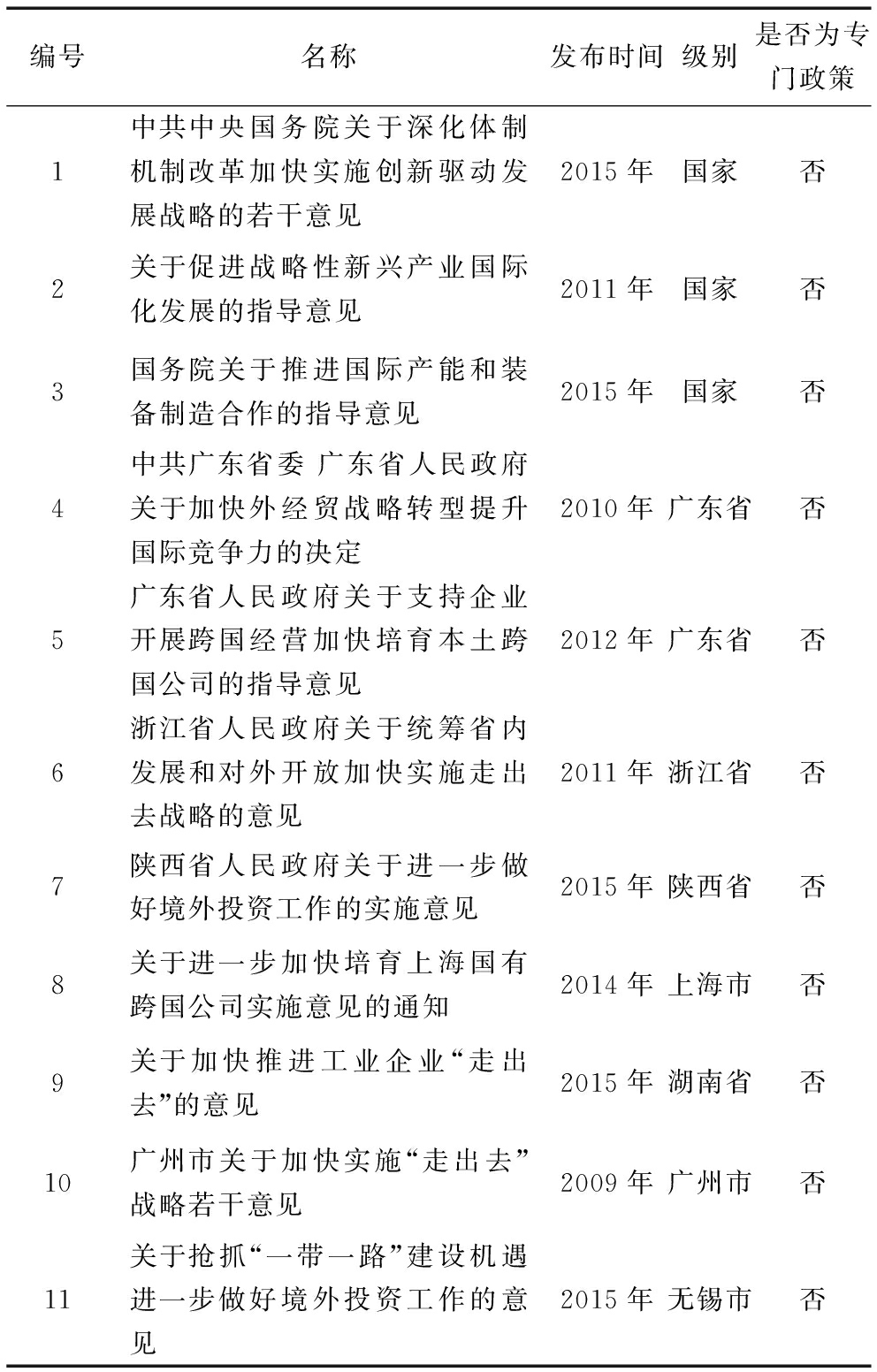 从涉及领域来看,大多数政策能覆盖所有产业类型,少数政策的目标群体有一定针对性和倾向性。其中,国家层面有2项针对战略性新兴产业、国际产能和装备制造领域的政策,如政策2明确提出“鼓励符合条件的企业通过并购、合资、合作、参股等多种方式在海外设立研发中心,重点扶持风能、太阳能、新型平板显示和高性能集成电路、新能源汽车、生物育种等行业与国外研究机构、产业集群建立战略合作关系”。地方层面,湖南省重点针对工业企业实施“走出去”战略。