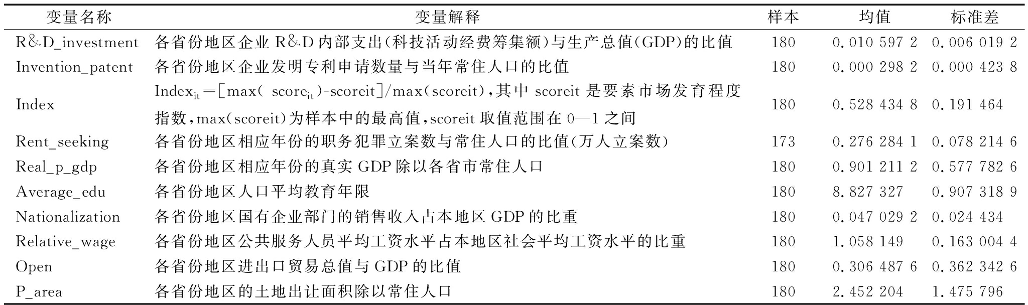 在计量模型方程中,本文采取寻租案件发生率度量因变量企业家寻租强度,标识为Rent_seeking,即中国i地区t年份公务人员职务犯罪立案数与常住人口(万人)的比值。企业微观数据显然比宏观数据能更为直接和准确地考察企业活动,但企业一般在财务报表中都对此类数据作隐性化处理,有些企业甚至不将其列入财务报表,故微观数据无法精确衡量企业寻租费用在超额管理费用中的真实比例,也无法判断企业是否存在未列入财务报表的寻租费用。因此,省级层面企业寻租微观数据实际不可得,使得本文尝试使用的宏观数据相对而言可能更为合理和真实。各省份公务人员职务犯罪立案数来自历年《中国检查院年鉴》和检察院公报,由于个别地区个别年份未公报此项数据,本文作为缺失处理。