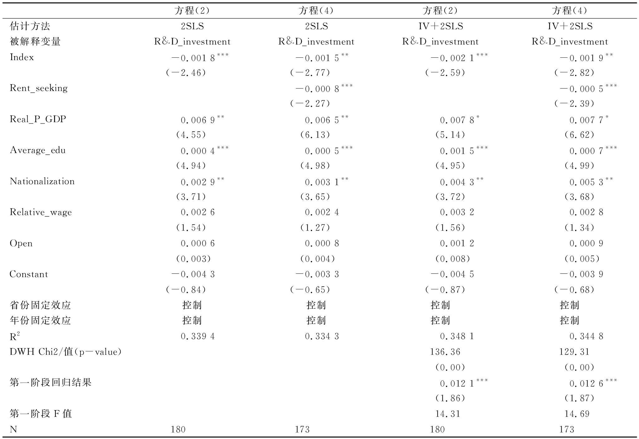 表3第一列固定效应2SLS估计方法的回归结果显示,要素市场扭曲指标Index对R&D_investment的作用效应在1%的统计水平上显著为负。