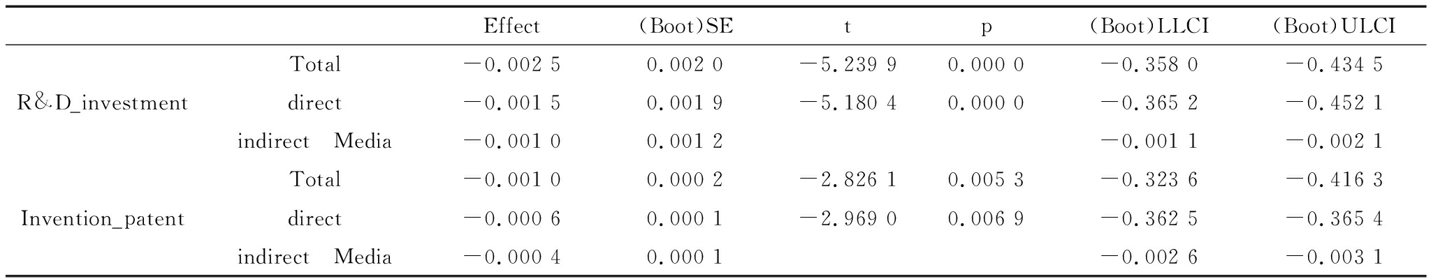 从第2~4行可看出,Index对R&D_intensity的总效应显著(-0.358 0,-0.434 5);直接效应显著(-0.365 2,-0.452 1)。Rent_seeking(Media)的中介效应也显著(-0.001 1,-0.002 1)。
