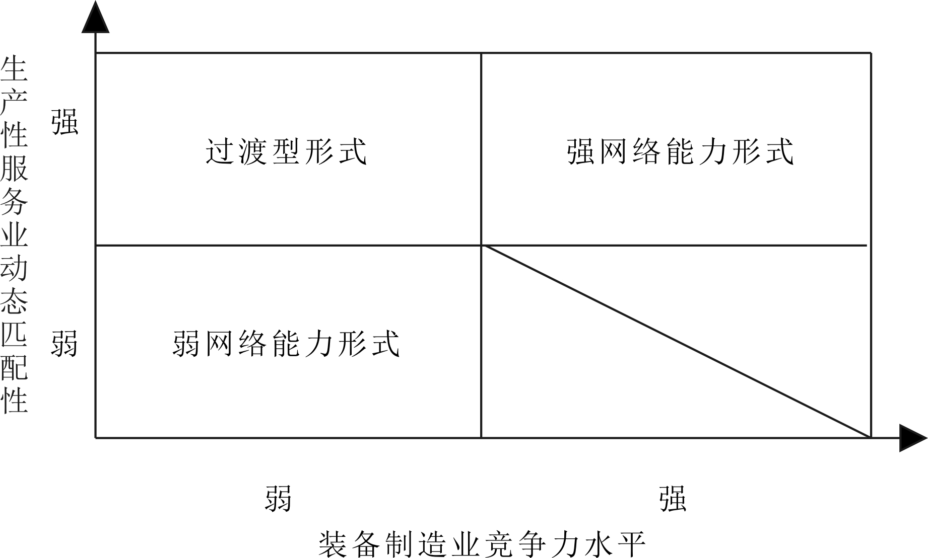 (2)网式融合形式。网式融合形成有两个基础条件:①不同装备制造业的竞争力决定了与其融合的生产性服务业;②生产性服务业与装备制造业的动态匹配性决定了其能够满足何种装备制造业需求。一方面,装备制造业根据自身价值环节竞争力选择融合目标,即所需的生产性服务业。另一方面,生产性服务业依据其匹配性选择装备制造业的市场类型。由此产生了不同网式融合形式,分别是强网络能力形式、过渡型形式以及弱网络能力形式,如图5所示。