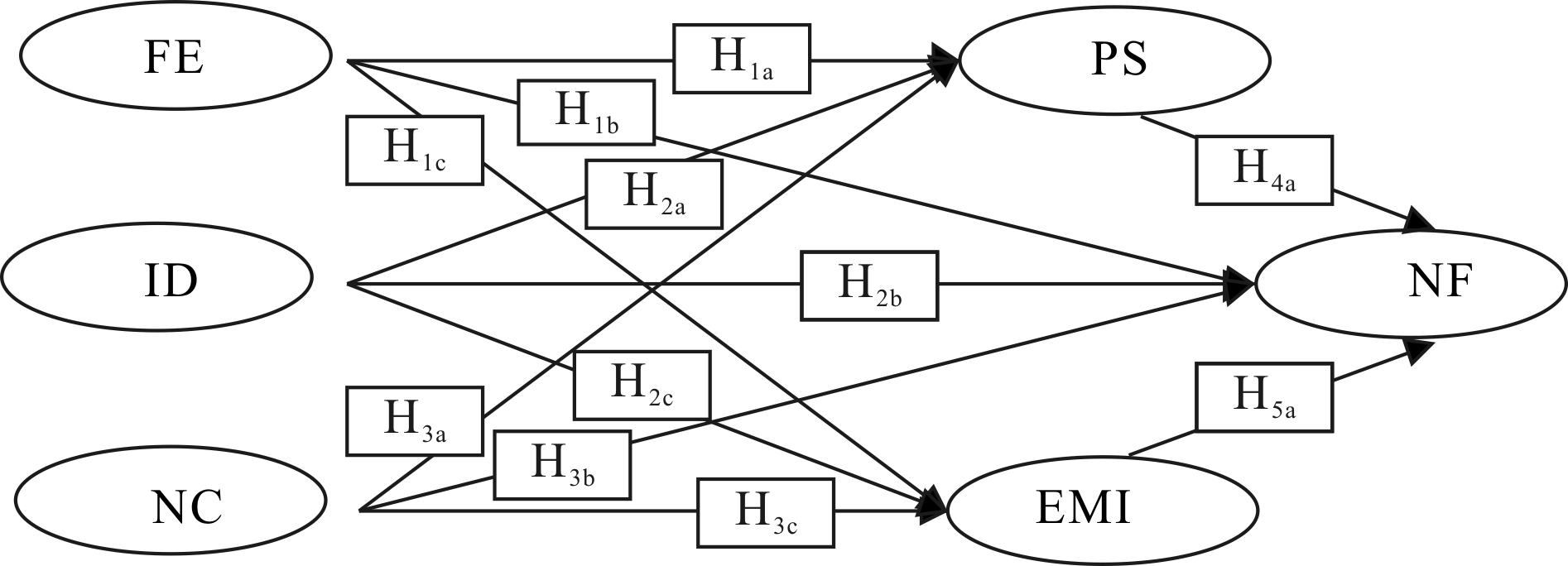 根据上文理论研究及假设,本文构建网式融合影响因素的理论模型,如图6所示。图6中每条路径代表一种假设,且本文假设均为正向影响,其中FE为要素驱动,ID为创新驱动,NC为网络能力,EMI为装备制造业竞争力水平,PS为生产性服务业动态匹配性,NF代表网式融合。