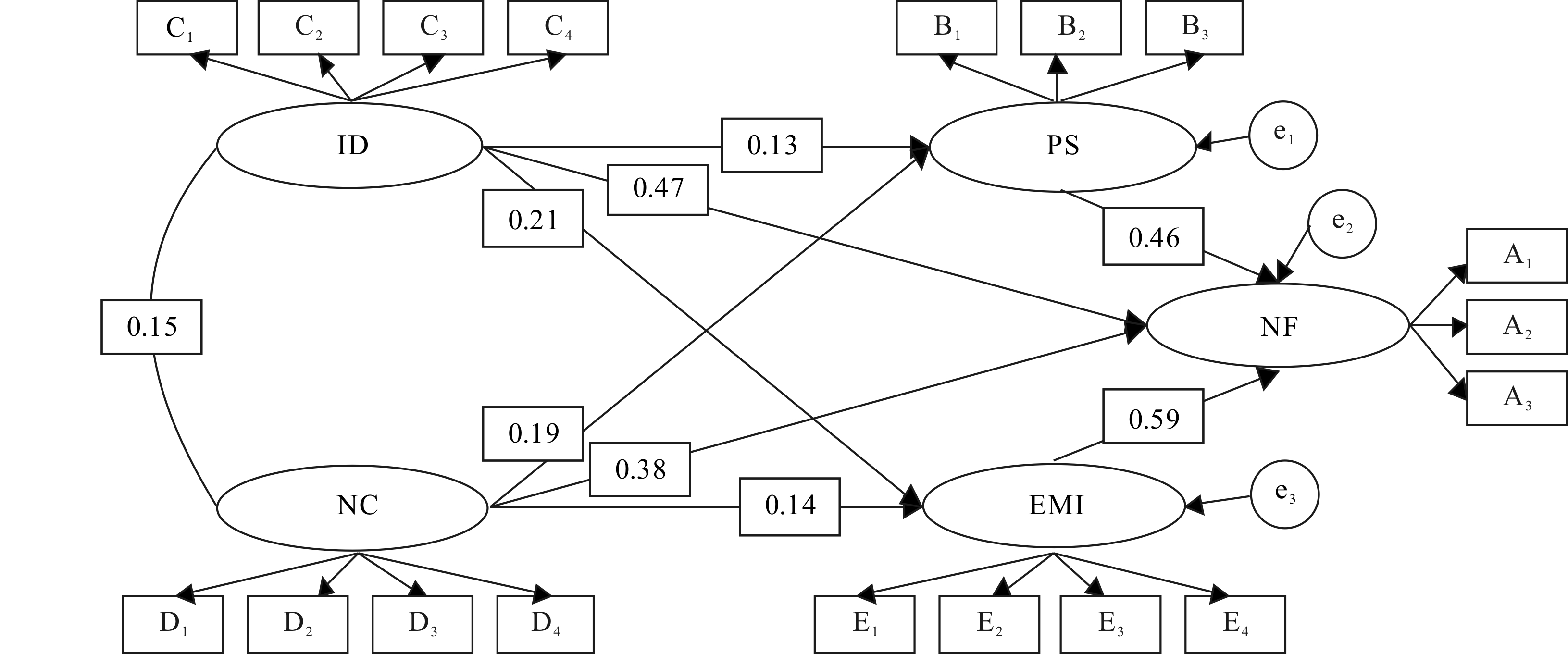 结构方程模型由结构模型和测量模型两个部分构成[24],结构模型检验潜在因素之间的关系,测量模型检验观测变量与潜在因素的关系。结构模型中作为因的潜在变量被称为外因潜在变量,作为果的潜在变量被称为内因潜在变量。由于外因潜在变量对内因潜在变量的解释受其它变因的影响,因此结构模型中还存在干扰潜在变量。测量模型中的观测变量是潜在因素的外显变量或测量指标,可以通过量表或者问卷等测量工具取得数据,潜在因素是观测变量间所形成的抽象概念,无法直接测量,因而需要通过观测变量测得的数据加以反映。