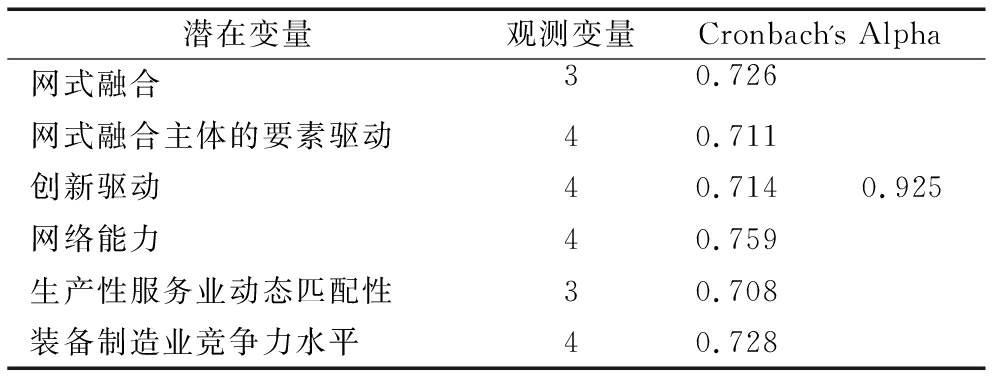 本文采用SPSS 19.0对问卷信度进行检验,信度即问卷测量的一致性或稳定性,利用Cronbach's α系数测量,当该系数值大于0.7时,表明该问卷具有良好的信度。检验结果显示,问卷整体Cronbach's α的值为0.925,6个潜变量即网式融合、网式融合主体要素驱动结构、创新驱动、网络能力、生产性服务业配套能力、装备制造业发展程度,对应的Cronbach's α值分别为0.726、0.711、0.714、0.759、0.708、0.728,均大于0.7,说明问卷信度良好,具有较高的一致性,如表1所示。