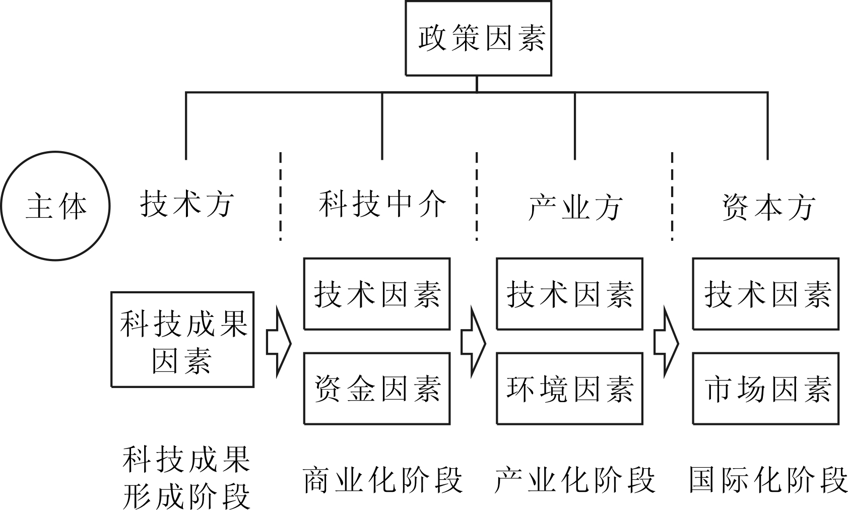 当前,学者对科技成果转移转化过程划分标准不一。本文将科技成果转移转化过程分为形成、商业化、产业化、国际化4个阶段,主体覆盖技术方、科技中介、产业方、资本方,影响因素包括政策、科技成果、资金、环境等,科技成果转移转化过程及其影响因素如图1所示。